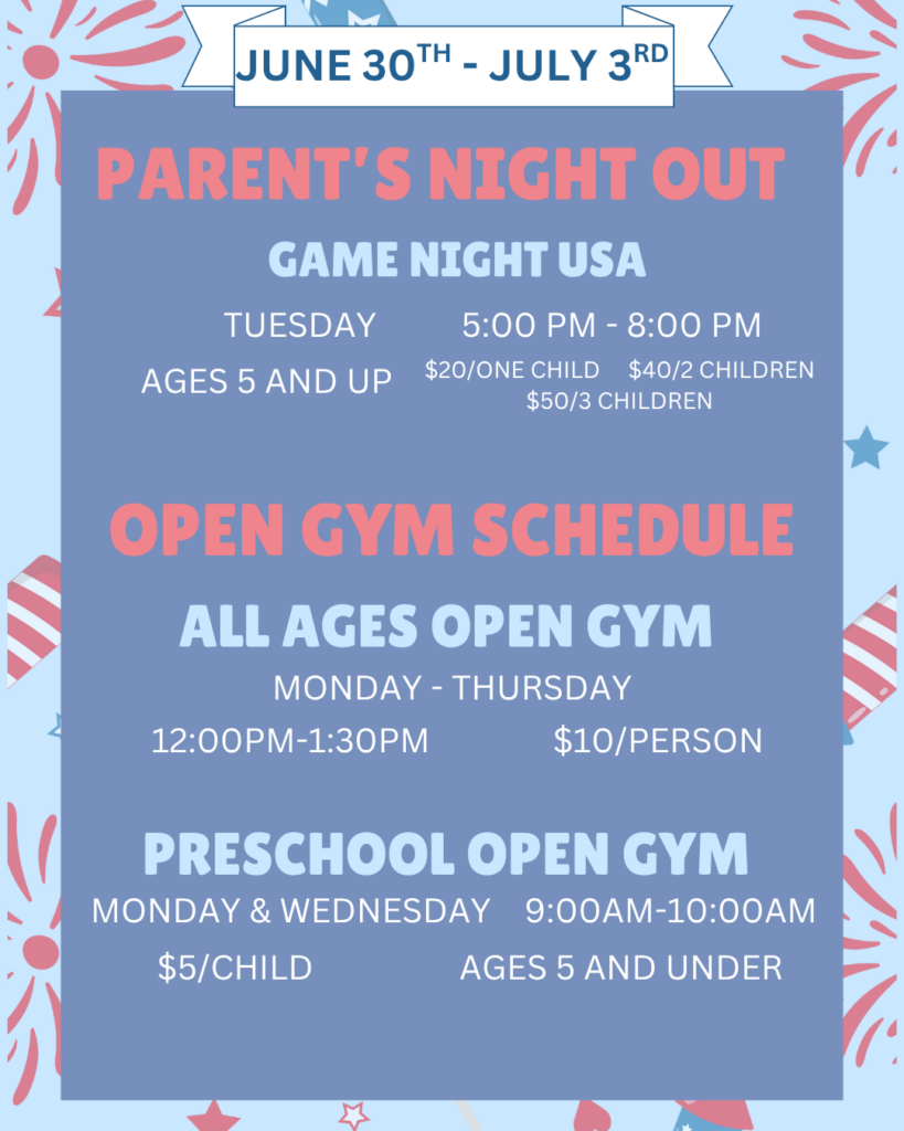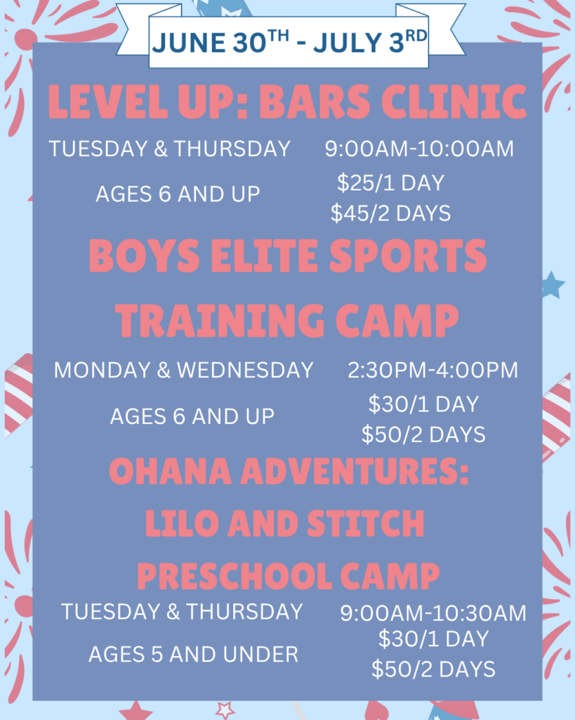 Looking for even more fun during the holiday week? We’ve got clinics, camps, open gyms, and special events lined up to keep the good times rolling! Whether your little gymnast wants to try something new or just keep moving, there’s something for everyone.